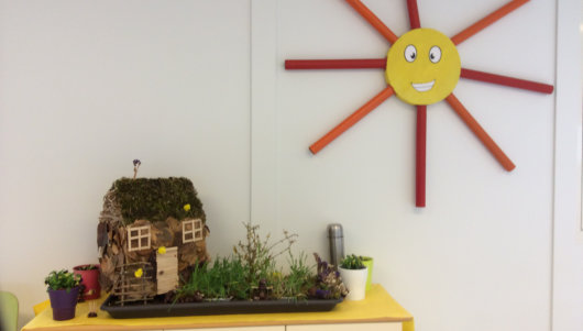 Un joli paysage de printemps en mousse imaginé par les plus petits du secteur SEES, ainsi que des tableaux en relief, décorent les murs du réfectoire.